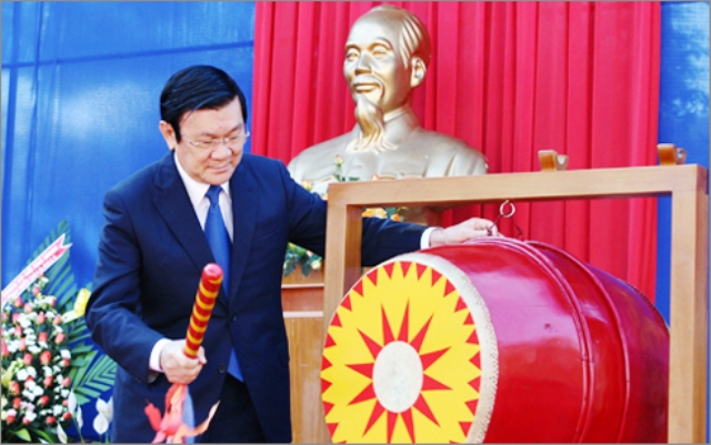 张晋创主席5日在龙安省出席后义高中新学年开学典礼。他在这里为后义高中建设工程落成剪彩并敲响2014-2015新学年开学鼓,考察校园设施及教学环境。